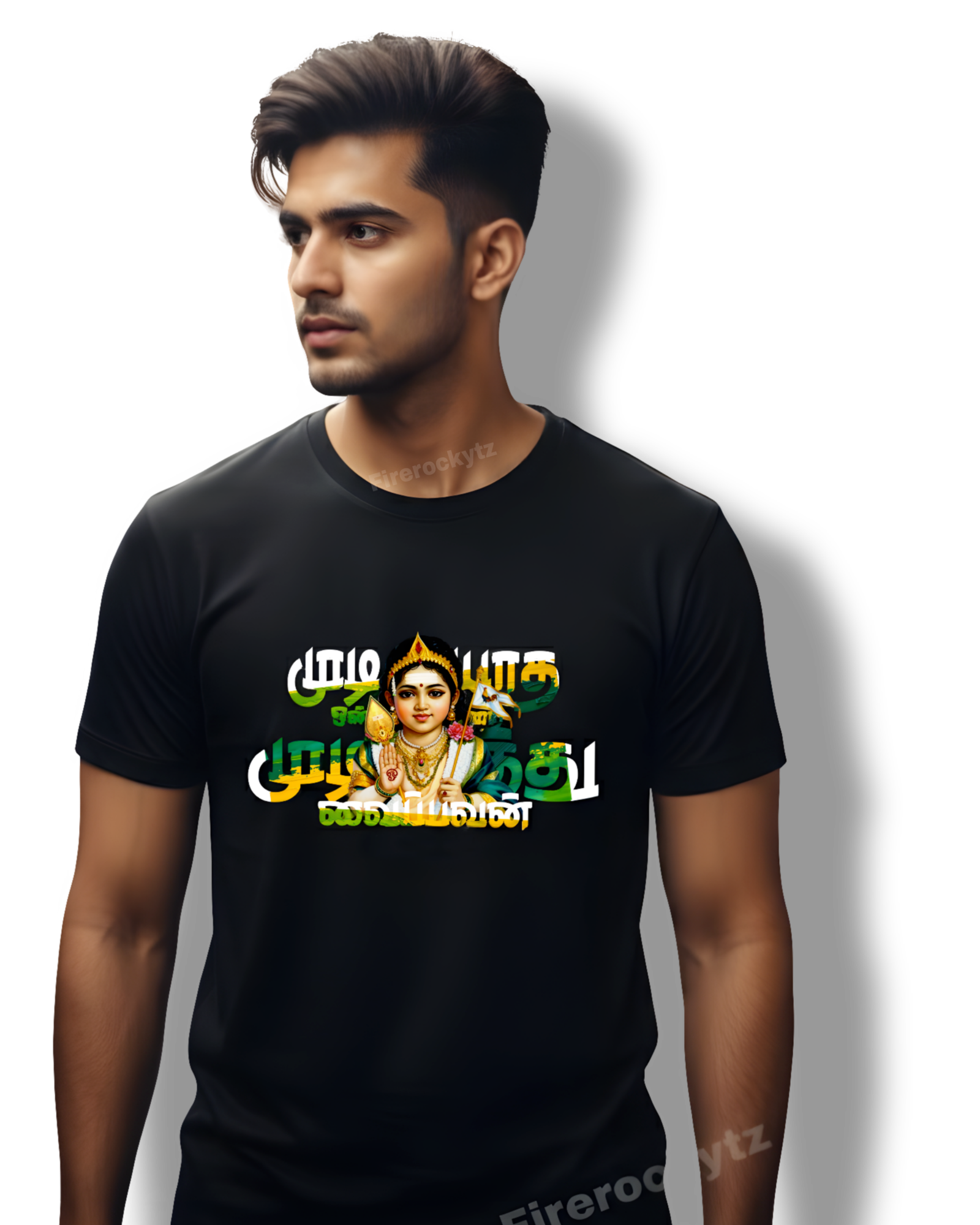 Celebrate Tamil culture and devotion with this striking Murugan-themed graphic T-shirt. Designed for those who love bold style and meaningful designs, this tee features a vibrant Murugan artwork combined with Tamil typography that stands out beautifully on the black fabric.