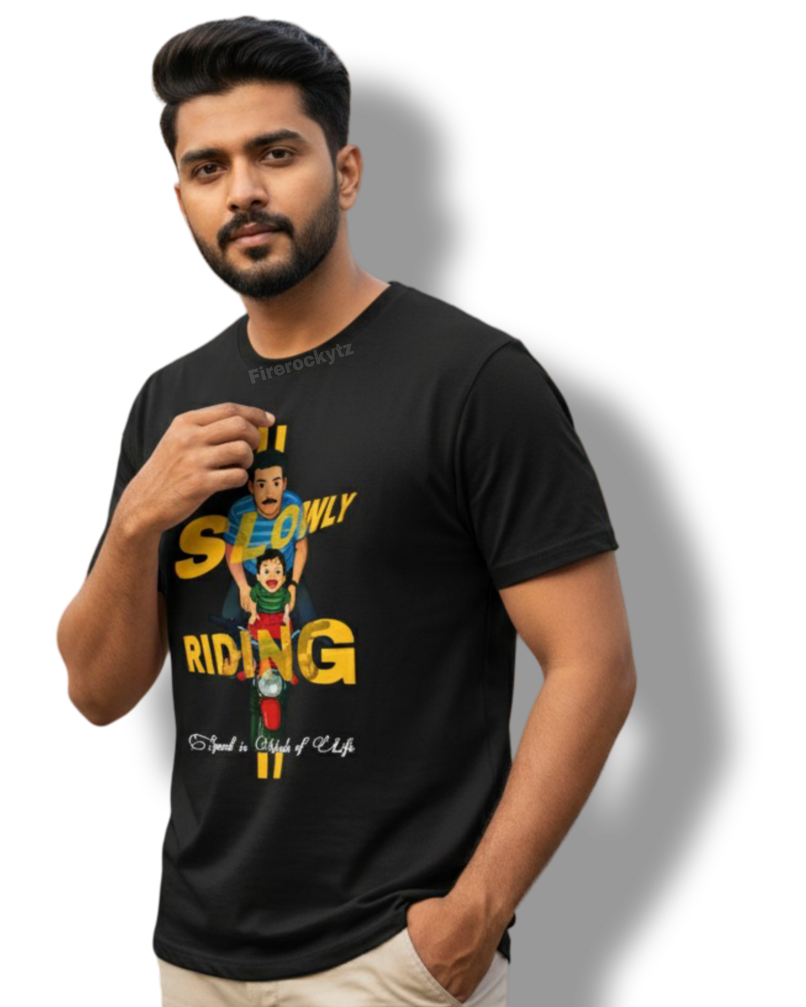 Express emotions, memories, and timeless connections with the Slowly Riding – Father & Child Graphic Printed T-Shirt. Designed for those who value family, simplicity, and meaningful style, this T-shirt blends premium fabric quality with an eye-catching illustration.